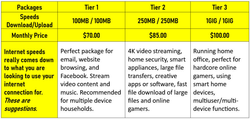 packages are listed with the basic fiber internet package starting at $70.00/month.